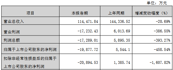 公司2025年营业总收入114,471.84万元,比上年同期下降20.69%;归属于上市公司股东的净利润-19,877.72万元,上年同期为5,544.10万元;扣除非经常性损益后归属于上市公司股东的净利润-20,894.53万元,上年同期为1,385.74万元。