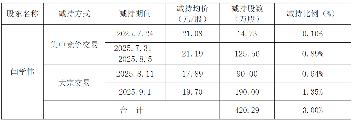 2025年7月24日至9月1日,闫学伟通过集中竞价交易和大宗交易方式减持公司股份420.29万股,套现金额约8324.15万元,闫学伟本次股份减持计划已实施完毕。