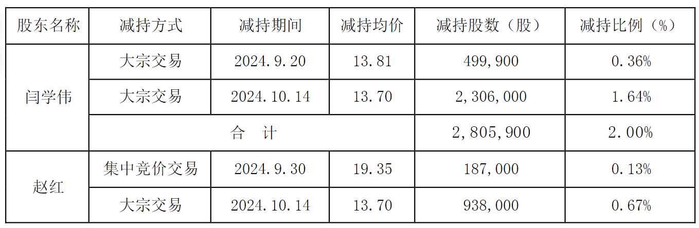 2024年9月20日至10月14日,闫学伟通过大宗交易方式减持公司股份2,805,900股,套现金额约3849.58万元。公司董事、总经理赵红通过集中竞价交易和大宗交易减持1,125,000股,套现金额约1646.91万元。闫学伟、赵红本次股份减持计划已实施完毕。
