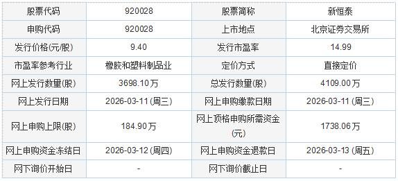 新恒泰2026年3月9日披露向不特定合格投资者公开发行股票并在北京证券交易所上市发行公告显示,若本次发行成功,预计公司募集资金总额为38,624.60万元,扣除预计发行费用5,159.37万元(不含增值税)后,预计募集资金净额为33,465.23万元。