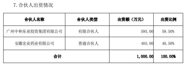 淮龙投资的合伙人为广州中和东亚投资集团有限公司及安徽宏业药业有限公司,合伙人类型分别为有限合伙人和普通合伙人,出资额分别为有限合伙人595.00万元、405.00万元,出资比例分别为59.50%、40.50%。淮龙投资的执行事务合伙人为安徽宏业药业有限公司(委派代表:王琦)。
