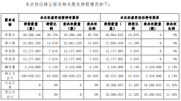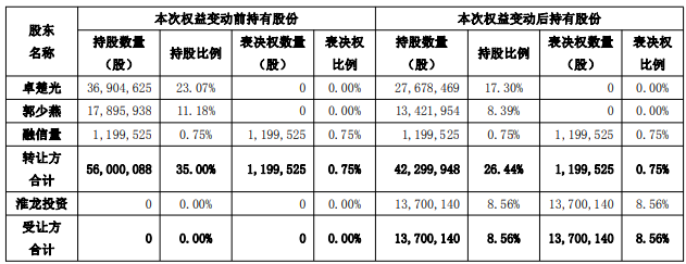 本次股份转让完成后,卓楚光持有公司27,678,469股股份,占公司总股本的17.30%,并继续放弃持有的剩余全部股份的表决权。郭少燕持有公司13,421,954股股份,占公司总股本的8.39%,并继续放弃持有的剩余全部股份的表决权。淮龙投资将持有公司13,700,140股股份,占公司总股本的8.56%,其享有标的股份对应的表决权。