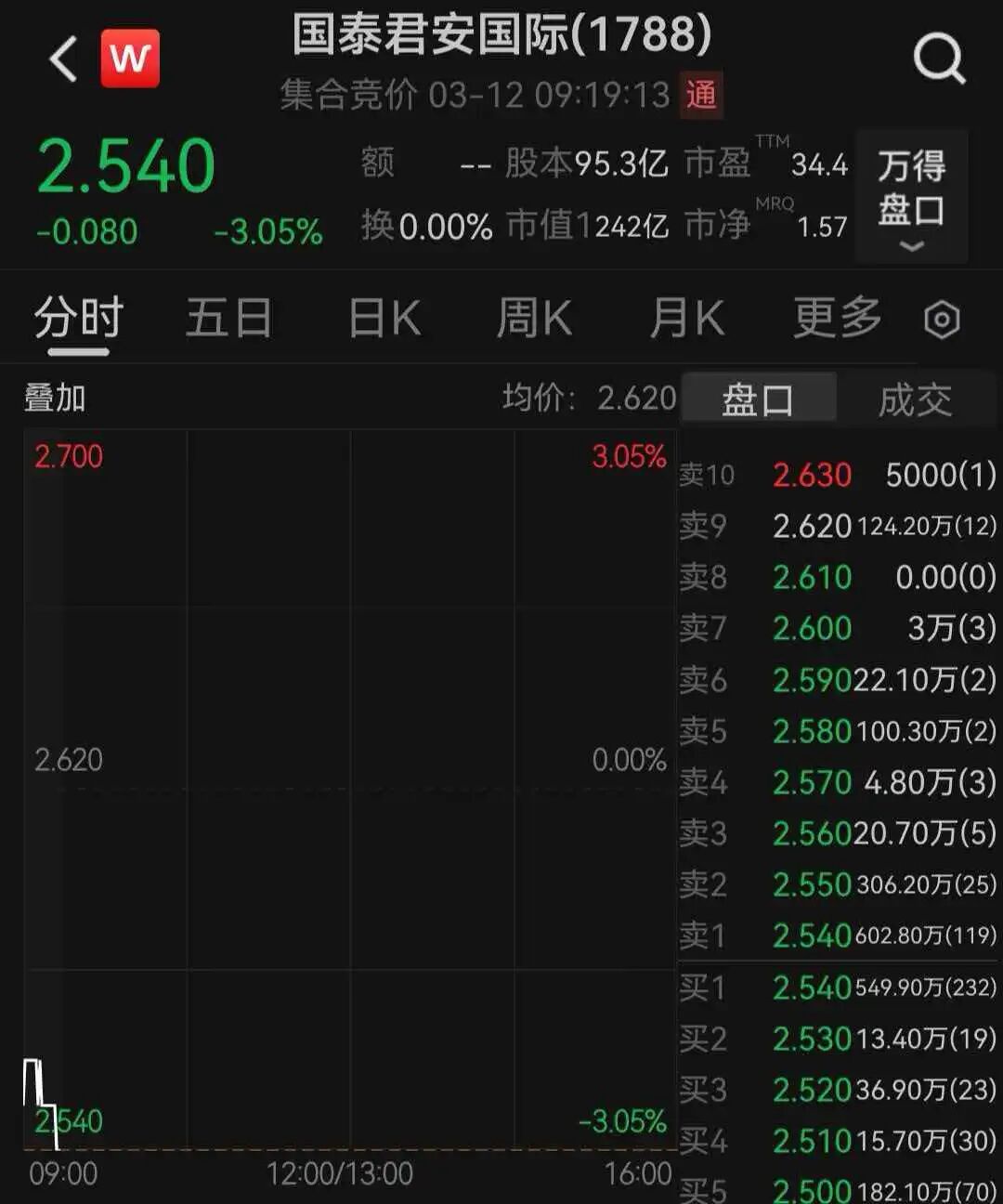 截至发稿,国泰君安国际跌3.05%,报2.54港元/股,市值约为242亿港元。