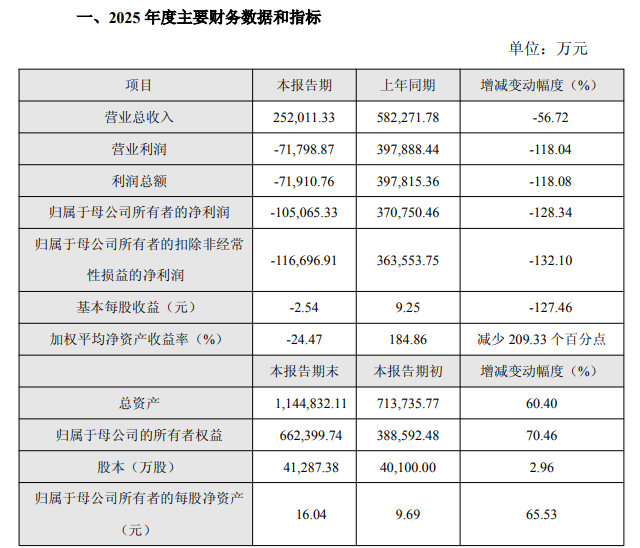 百利天恒2025年年度业绩快报公告显示,百利天恒2025年营收25.20亿元,同比下滑56.72%;归母净利润-10.51亿元,去年同期为37.08亿元;扣非净利润为-11.67亿元,去年同期为36.36亿元。