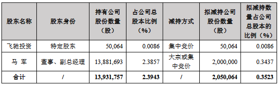 按上一交易日公司收盘价37.74元计算,飞驰投资与马军合计拟减持套现金额约77,369,415.36元。
