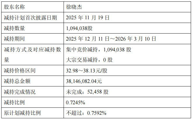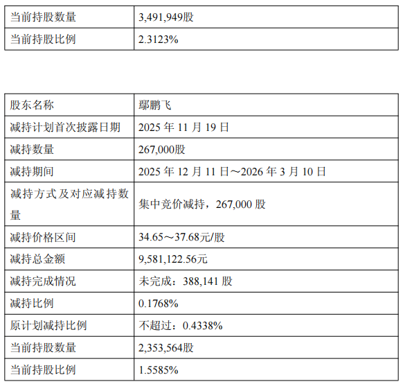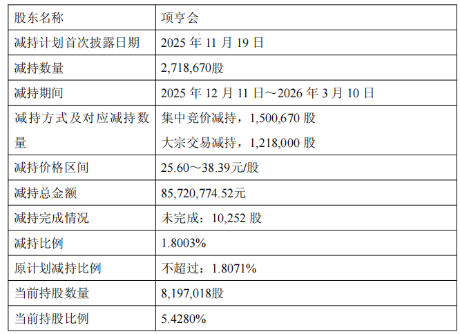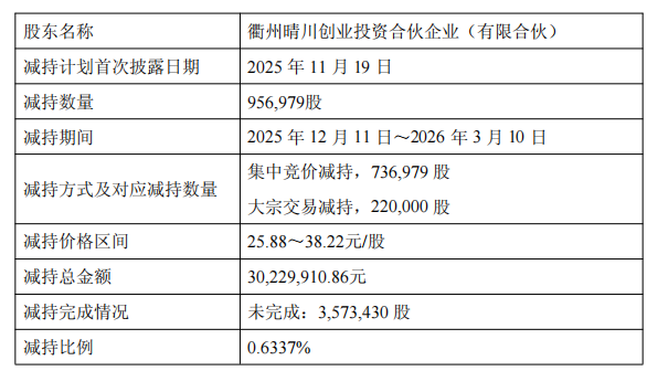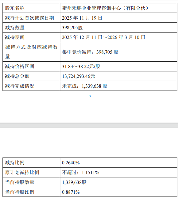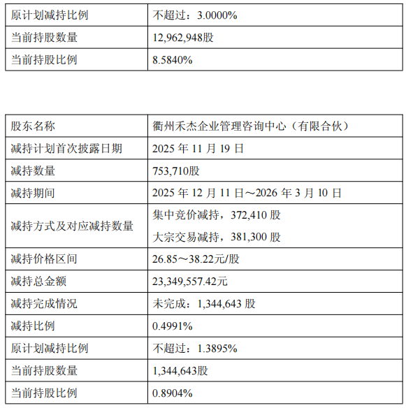 2025年12月11日至2026年3月10日,公司实际控制人的一致行动人晴川投资、衢州禾鹏、衢州禾杰通过集中竞价及大宗交易方式累计减持公司股份2,109,394股,占公司股份总数的1.3968%,其中,通过集中竞价方式减持公司股份1,508,094股,占公司股份总数的0.9986%,通过大宗交易方式减持公司股份601,300股,占公司股份总数的0.3982%。减持总金额合计67303761.74元。