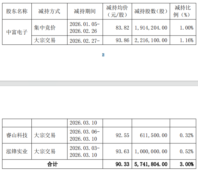 2026年1月5日至2026年3月10日,中富电子、睿山科技、泓锋实业通过集中竞价交易方式和大宗交易方式累计减持中富电路5,741,804.00股股份,减持均价为90.33元/股,减持比例3.00%。经计算,中富电子、睿山科技、泓锋实业共套现约5.19亿元。