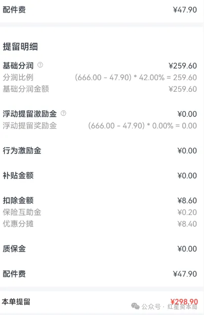乱收费、价格虚高的背后是啄木鸟高额的抽成比例,梁先生于2024年9月入职啄木鸟平台担任维修师傅,目前已离职。他告诉红星资本局,平台对每单收入都有考核,比如空调单价要在160元或180元以上,而每单维修师傅仅能拿到消费者支付总金额的40%左右,相当于平台抽成近60%。例如,他曾去维修空气能热水器,订单支付总金额为666元,而他到手仅298.9元。