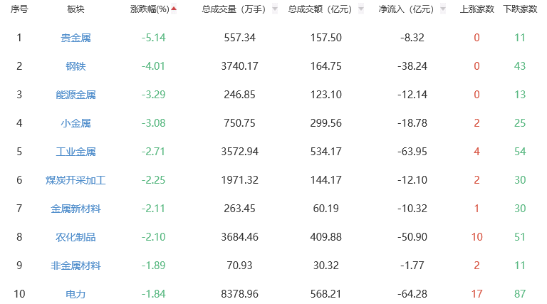 板块方面,白酒、种植业与林业、养殖业等板块涨幅居前,贵金属、钢铁、能源金属等板块跌幅居前。