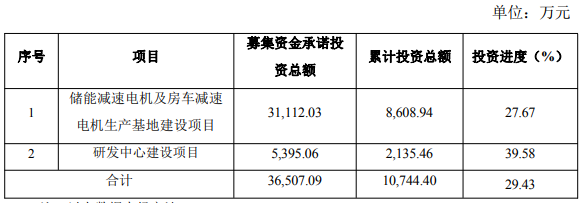 截至2025年12月31日,公司已累计投入10,744.40万元募集资金,其中储能减速电机及房车减速电机生产基地建设项目的募集资金承诺投资总额为31,112.03万元,累计投资总额为8,608.94万元,投资进度为27.67%;研发中心建设项目募集资金承诺投资总额为5,395.06万元,累计投资总额为2,135.46万元,投资进度为39.58%。两募集资金承诺投资总额为36,507.09万元,累计投资总额为10,744.40万元,投资进度为29.43%。
