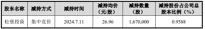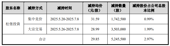 宸展光电2025年7月10日披露的关于股东减持计划实施完成的公告显示,松堡投資于2025年5月20日至2025年7月8日减持宸展光电5,245,500股,减持股份占公司总股本比例的2.97%,减持均价为29.85元/股,套现156,578,175元。