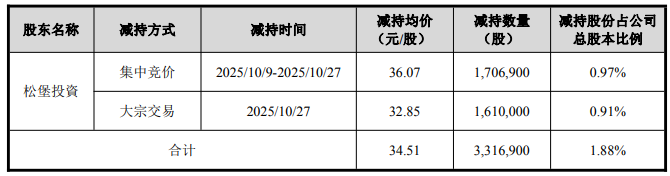 宸展光电2026年1月10日披露的关于股东减持计划实施期限届满的公告显示,2025年10月9日至2025年10月27日,松堡投資减持宸展光电3,316,900股,减持股份占公司总股本比例的1.88%,减持均价为34.51元/股,套现114,466,219元。