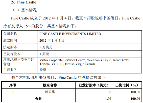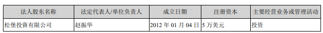 松堡投資系境外法人。在宸展光电2020年11月2日披露的首次公开发行股票并上市招股说明书中,松堡投資的名字是Pine Castle,持股数为14,400,00股,持股比例为15.00%,系公司第二大股东,系公司设立时持有公司5%以上股权的主要发起人之一。PineCastle由赵振华100%持股。