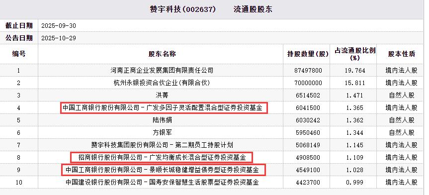 截至2025年9月30日,赞宇科技前十大流通股股东中,中国工商银行股份有限公司-广发多因子灵活配置混合型证券投资基金、招商银行股份有限公司-广发均衡成长混合型证券投资基金、中国工商银行股份有限公司-景顺长城稳健增益债券型证券投资基金持股数量分别为6041500股、4908500股、4549100股,分列第4、第8、第9位。