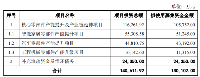 本次向不特定对象发行可转换公司债券拟募集资金总额不超过人民币130,102.00万元,扣除发行费用后募集资金净额拟用于核心零部件产能提升及产业链延伸项目、补充流动资金及偿还债务。
