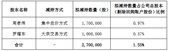 周孝伟、罗耀东合计减持公司股份不超过2,700,000股,不超过公司总股本的1.55%。