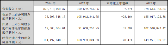 2022年、2023年、2024年,公司的营业收入分别为9.79亿元、9.53亿元、8.79亿元;归属于上市公司股东的净利润分别为1.55亿元、1.06亿元、7579.55万元;归属于上市公司股东的扣除非经常性损益的净利润1.08亿元、9165.83万元、5930.36万元。
