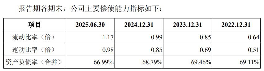 2022年末、2023年末、2024年末、2025年6月末,公司资产负债率分别为69.11%、69.46%、68.79%、66.99%,流动比率分别为0.64倍、0.85倍、0.99倍、1.17倍,速动比率分别为0.51倍、0.69倍、0.85倍、0.98倍。