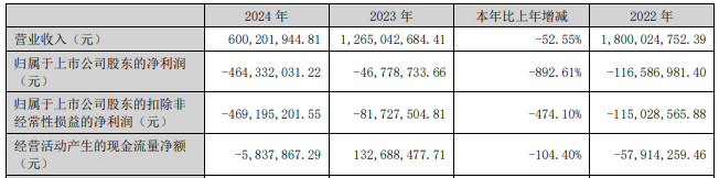 2022年至2024年,雪浪环境归属于上市公司股东的净利润分别为-1.17亿元、-0.47亿、-4.64亿元;归属于上市公司股东的扣除非经常性损益的净利润分别为-1.15亿元、-0.82亿元、-4.69亿元。
