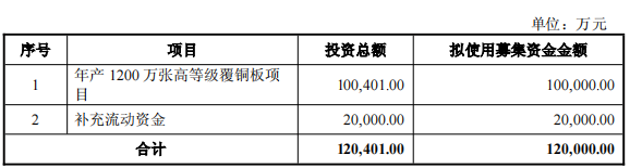 本次向特定对象发行股票募集资金总额不超过人民币120,000.00万元(含本数),扣除发行费用后的募集资金净额将用于投资年产1200万张高等级覆铜板项目、补充流动资金。