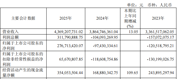 华正新材昨日晚间披露2025年年度报告显示,2025年实现营业收入43.69亿元,同比增长13.05%;归属于上市公司股东的净利润2.77亿元,上年同期为-9743.03万元;归属于上市公司股东的扣除非经常性损益的净利润6567.08万元,上年同期为-1.19亿元。2023年归属于上市公司股东的净利润-1.21亿元。