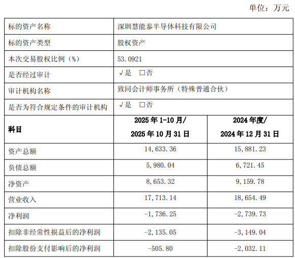 2024年度、2025年1至10月,慧能泰营业收入分别为18,654.49万元、17,713.14万元,净利润分别为-2,739.73万元、-1,736.25万元,扣除非经常性损益后的净利润分别为-3,149.04万元、-2,135.05万元。