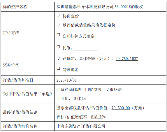 本次交易定价以评估基准日(2025年10月31日)标的公司股东全部权益评估值为核心参考,遵循“公开市场参照、同口径可比、差异修正可解释”的定价原则。最终选定以市场法评估结果作为评估结论。股东全部权益评估79,500.00万元,评估增值率818.72%。