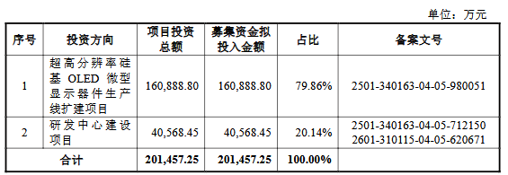 视涯科技本次发行募集资金总额226,800.00万元,实际募集资金净额为211,473.15万元。公司最终募集资金净额比原计划多10,015.9万元。视涯科技2026年3月20日披露的招股书显示,公司拟募集资金201,457.25万元,计划用于超高分辨率硅基OLED微型显示器件生产线扩建项目、研发中心建设项目。