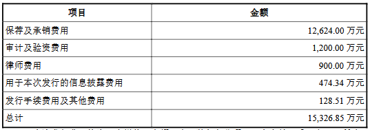 视涯科技本次发行费用合计15,326.85万元(不含增值税),其中保荐及承销费用12,624.00万元。