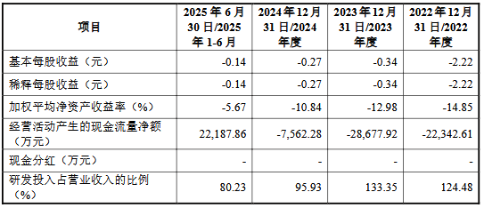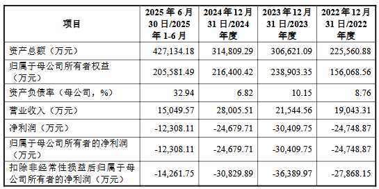 具体来看,2022年至2025年1-6月,公司实现营业收入分别为19,043.31万元、21,544.56万元、28,005.51万元、15,049.57万元,归属于母公司所有者的净利润分别为-24,748.87万元、-30,409.75万元、-24,679.71万元、-12,308.11万元,扣除非经常性损益后归属于母公司所有者的净利润分别为-27,868.15万元、-36,389.97万元、-30,829.89万元、-14,261.75万元。