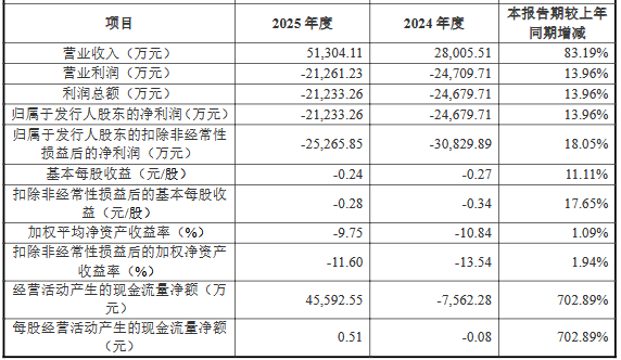 2025年度,公司实现营业收入51,304.11万元,较上年同期增长83.19%;归属于发行人股东的净利润-21,233.26万元,较上年同期增长13.96%;扣除非经常性损益后归属于发行人股东的净利润为-25,265.85万元,较上年同期增长18.05%;经营活动产生的现金流量净额为45,592.55万元,较上年度增长702.89%。