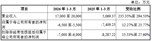 公司预计2026年1-3月营业收入为17,000万元至20,000万元,较上年同期的5,069.37万元增长235.35%至294.53%;归属于上市公司股东的净利润为亏损6,500万元至亏损5,500万元,上年同期亏损7,409.25万元;扣除非经常性损益后归属于上市公司股东的净利润为亏损7,000万元至亏损6,000万元,上年同期亏损8,287.22万元。