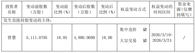 中国经济网北京3月26日讯 赛腾股份(603283.SH)昨日晚间披露关于持股5%以上股东权益变动触及1%刻度的提示性公告称,公司于2026年3月25日收到公司股东曾慧的通知,其于2026年3月10日至2026年3月24日期间通过集中竞价及大宗交易方式累计减持公司股份合计2,310,715股,占公司总股本的0.85%。曾慧持股比例由18.85%减少至18.00%,本次权益变动触及1%刻度。