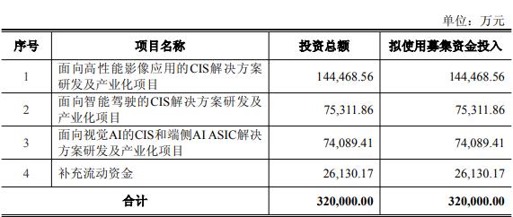 本次向特定对象发行募集资金总额不超过人民币320,000.00万元(含本数),扣除发行费用后的募集资金净额将用于面向高性能影像应用的CIS解决方案研发及产业化项目、面向智能驾驶的CIS解决方案研发及产业化项目、面向视觉AI的CIS和端侧AI ASIC解决方案研发及产业化项目、补充流动资金。