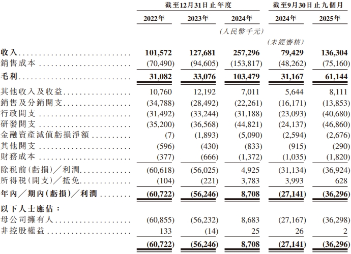 于2022年、2023年、截至2024年9月30日止九个月及截至2025年9月30日止九个月,极视角分别产生亏损净额人民币60.7百万元、人民币56.2百万元、人民币27.1百万元及人民币36.3百万元。于2024年,极视角录得净利润人民币8.7百万元。