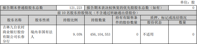 2025年三季度报告显示,截至报告期末,众泰汽车的第一大股东为吉林九台农村商业银行股份有限公司长春分行,持股数量456,104,553股,持股比例9.05%。