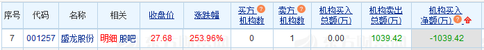 龙虎榜数据显示,卖出盛龙股份金额最大的前5名中,1家为机构专用席位。经统计,机构席位今日卖出盛龙股份净额为1039.42万元。