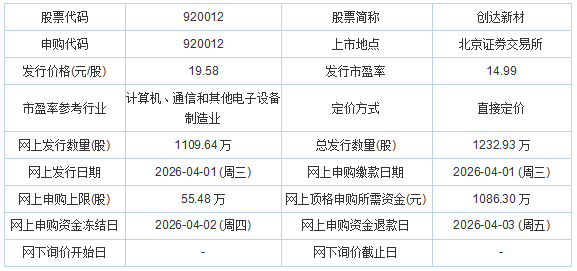 创达新材2026年3月30日披露的向不特定合格投资者公开发行股票并在北京证券交易所上市发行公告显示,若本次发行成功,预计公司募集资金总额为24,140.86万元,扣除发行费用2,693.87万元(不含增值税)后,预计募集资金净额为21,446.99万元。