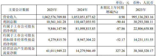 2025年,两面针营业收入为10.63亿元,同比增长0.90%;归属于上市公司股东的净利润984.61万元,同比下降87.86%;归属于上市公司股东的扣除非经常性损益的净利润427.98万元,同比下降52.17%;经营活动产生的现金流量净额6101.19万元,同比增长327.26%。
