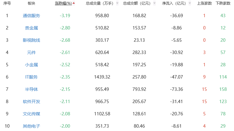 板块方面,油气开采及服务、医药商业、化学制药等板块涨幅居前,通信服务、贵金属、影视院线等板块跌幅居前。