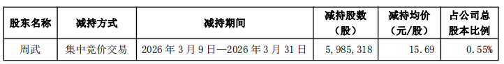近日,公司收到周武出具的《股份减持计划实施完成告知函》,2026年3月9日至2026年3月31日,周武通过集中竞价交易方式减持5,985,318股股份,减持均价15.69元/股。经计算,周武套现约9390.96万元。