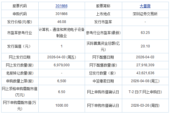 大普微2026年4月2日披露的首次公开发行股票并在创业板上市发行公告显示,按本次发行价格46.08元/股计算,公司募集资金总额预计为201,008.50万元,扣除预计发行费用13,129.51万元(不含增值税)后,预计募集资金净额约为187.878.99万元。