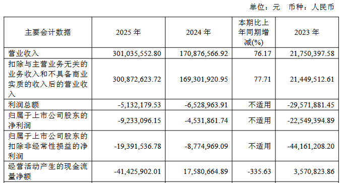 2023年至2025年,公司营业收入分别为2,175.04万元、17,087.66万元、30,103.56万元,归属于上市公司股东的净利润分别为-2,254.94万元、-453.19万元、-923.31万元,归属于上市公司股东的扣除非经常性损益的净利润分别为-4,416.12万元、-877.50万元、-1,939.15万元,经营活动产生的现金流量净额为357.08万元、1,758.07万元、-4,142.59万元。