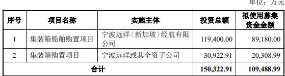 宁波远洋发行募集资金总额为1,075,696,605.48元,募集资金净额为1,025,545,791.01元。据宁波远洋招股书,公司拟募集资金102,554.58万元,分别用于集装箱船购置项目、散货船购置项目、10,000TEU集装箱购置项目、补充流动资金项目。