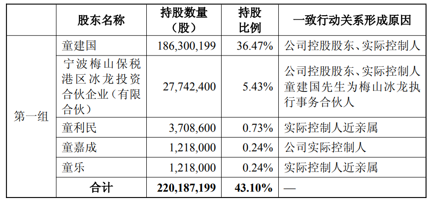 本次对外转让及减持主体宁波梅山保税港区冰龙投资合伙企业(有限合伙)(以下简称“梅山冰龙”)持有公司无限售条件流通股27,742,400股,占公司总股本的5.43%,为公司控股股东、实际控制人童建国的一致行动人。