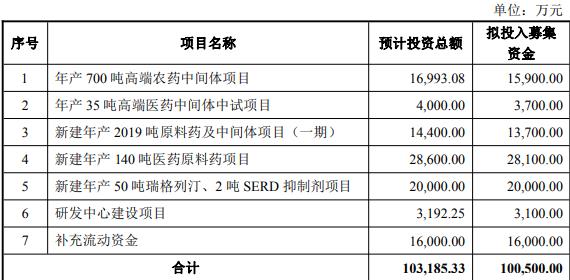 公司本次向特定对象发行股票募集资金总额不超过100,500.00万元(含本数),在扣除发行费用后将用于“年产700吨高端农药中间体项目”、“年产35吨高端医药中间体中试项目”、“新建年产2019吨原料药及中间体项目(一期”)、“新建年产140吨医药原料药项目”、“新建年产50吨瑞格列汀、2吨SERD抑制剂项目”、“研发中心建设项目”、“补充流动资金”。