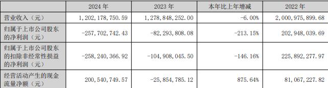 2024年,公司实现营业收入12.02亿元,同比减少6.00%;归属于上市公司股东的净利润-2.58亿元,2023年为-8229.38万元;扣除非经常损益后的净利润-2.58亿元,2023年为-1.05亿元;经营活动产生的现金流量净额2.01亿元。