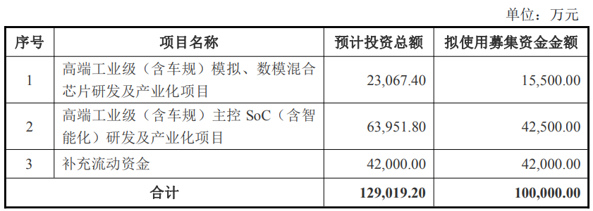 中颖电子本次扣除发行费用后的募集资金净额将用于“高端工业级(含车规)模拟、数模混合芯片研发及产业化项目”、“高端工业级(含车规)主控SoC(含智能化)研发及产业化项目”、“补充流动资金”。