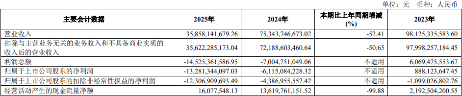 年报显示,2025年,公司实现签约金额300.2亿元。受公司近年销售规模下降影响,本年可结转面积较上年减少,报告期内营业收入下滑至358.58亿元,同时,公司基于谨慎性原则计提了存货跌价准备和信用损失准备,叠加房地产业务结算毛利率降至7.93%,报告期内归属于母公司所有者的净利润为-132.81亿元。