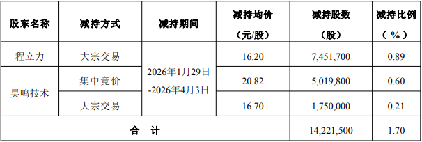 2026年1月29日至2026年4月3日,程立力通过大宗交易方式减持7,451,700股,减持均价为16.20元/股。昊鸣技术通过集中竞价方式减持5,019,800股,减持均价为20.82元/股;通过大宗交易方式减持1,750,000股,减持均价为16.70元/股。